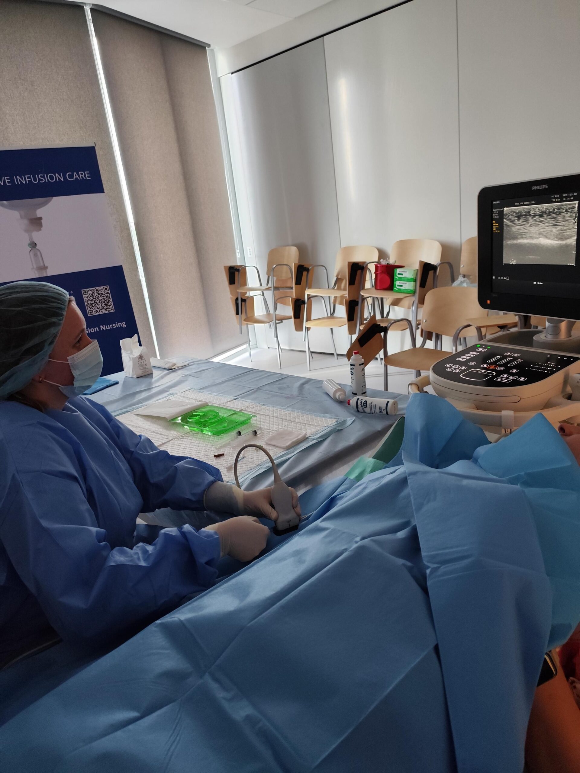 - Kaniulacja pod kontrolą USG – wprowadzanie długich kaniul dożylnych (LPC) w trudnym dostępie dożylnym